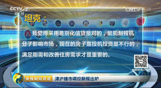 在《央视财经评论》的演播室里,主持人张琳说到,这次还是要打击投资投机,但是我们有一些普通的自住型住房的改善者,觉得也受到了影响,我们的网友也有一些相同的感受。网友悟说,首付比例的提高,可以抑制部分炒房客,但是对于需求自住改善型的人来说更加不容易了,大家觉得这次的政策是不是太紧了?