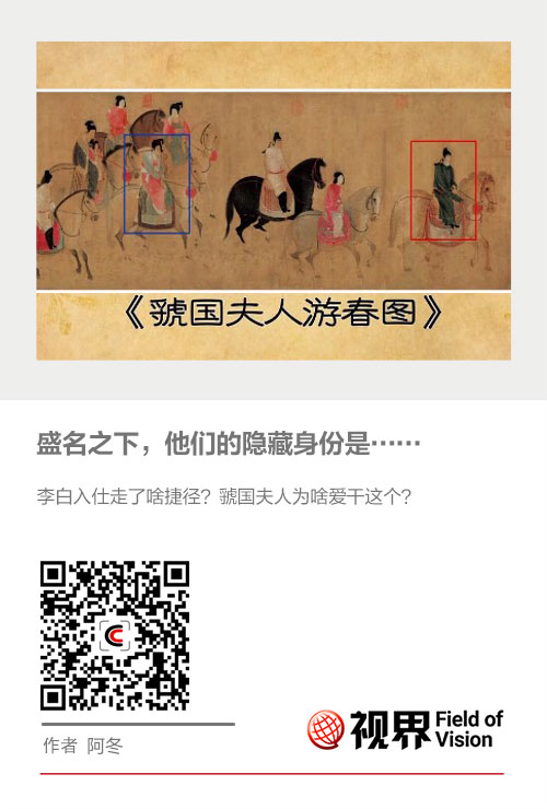 画中走在队伍最前面,骑着五花马,穿男装的这位就是杨贵妃的三姐,虢国夫人。杨玉环的美貌就不用说了,姐姐虢国夫人也不逊色。诗人张祜在诗中描绘了《虢国夫人游春图》的情境。
